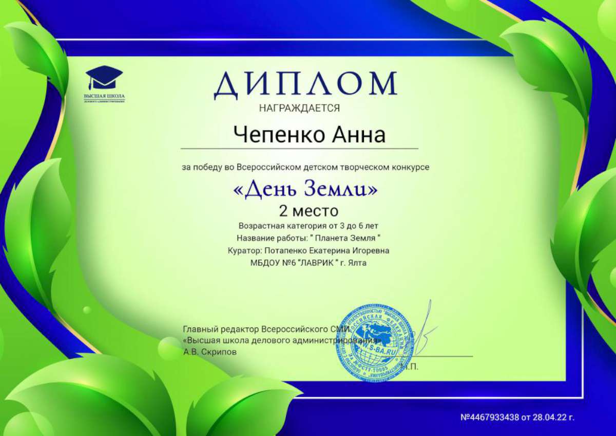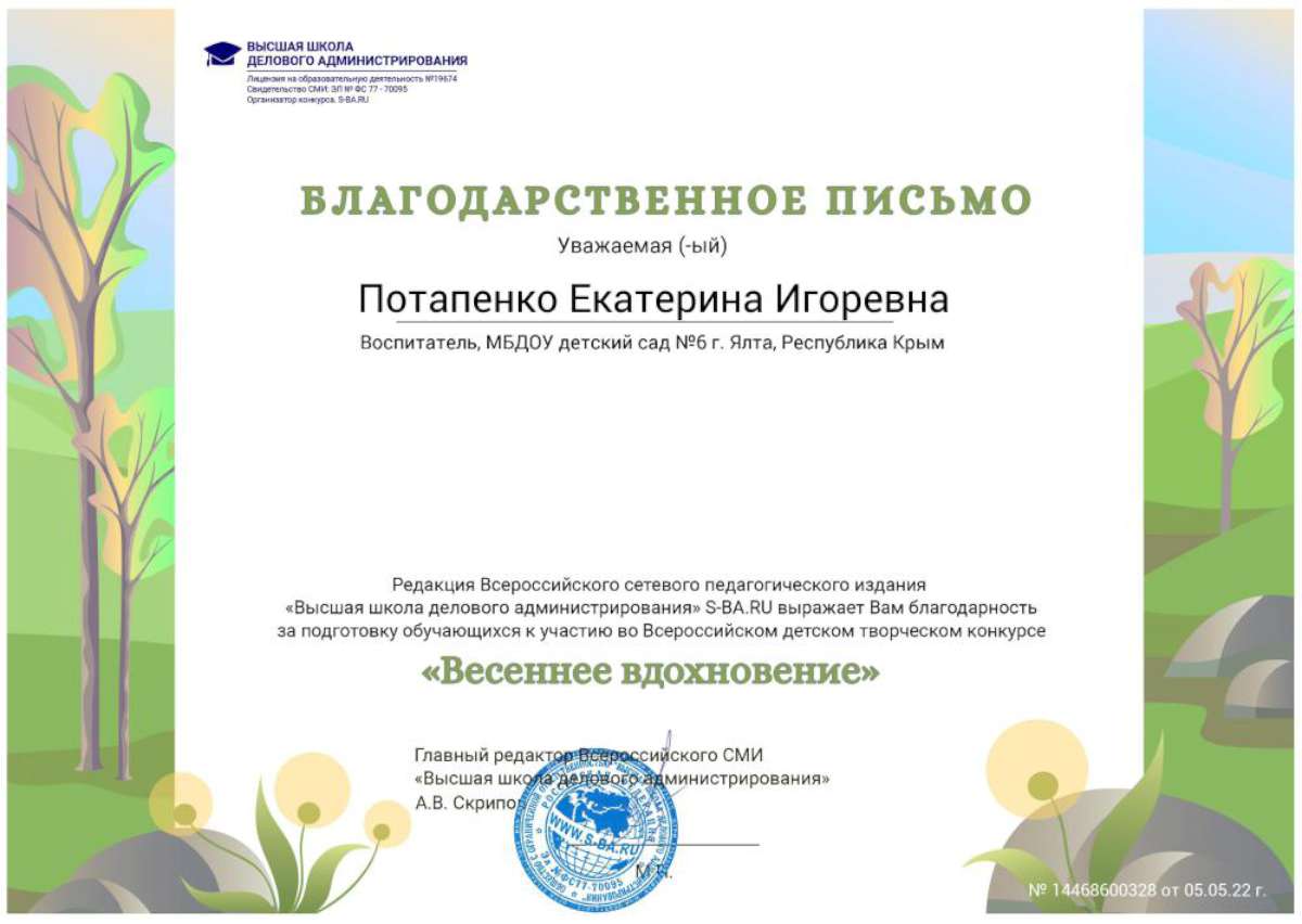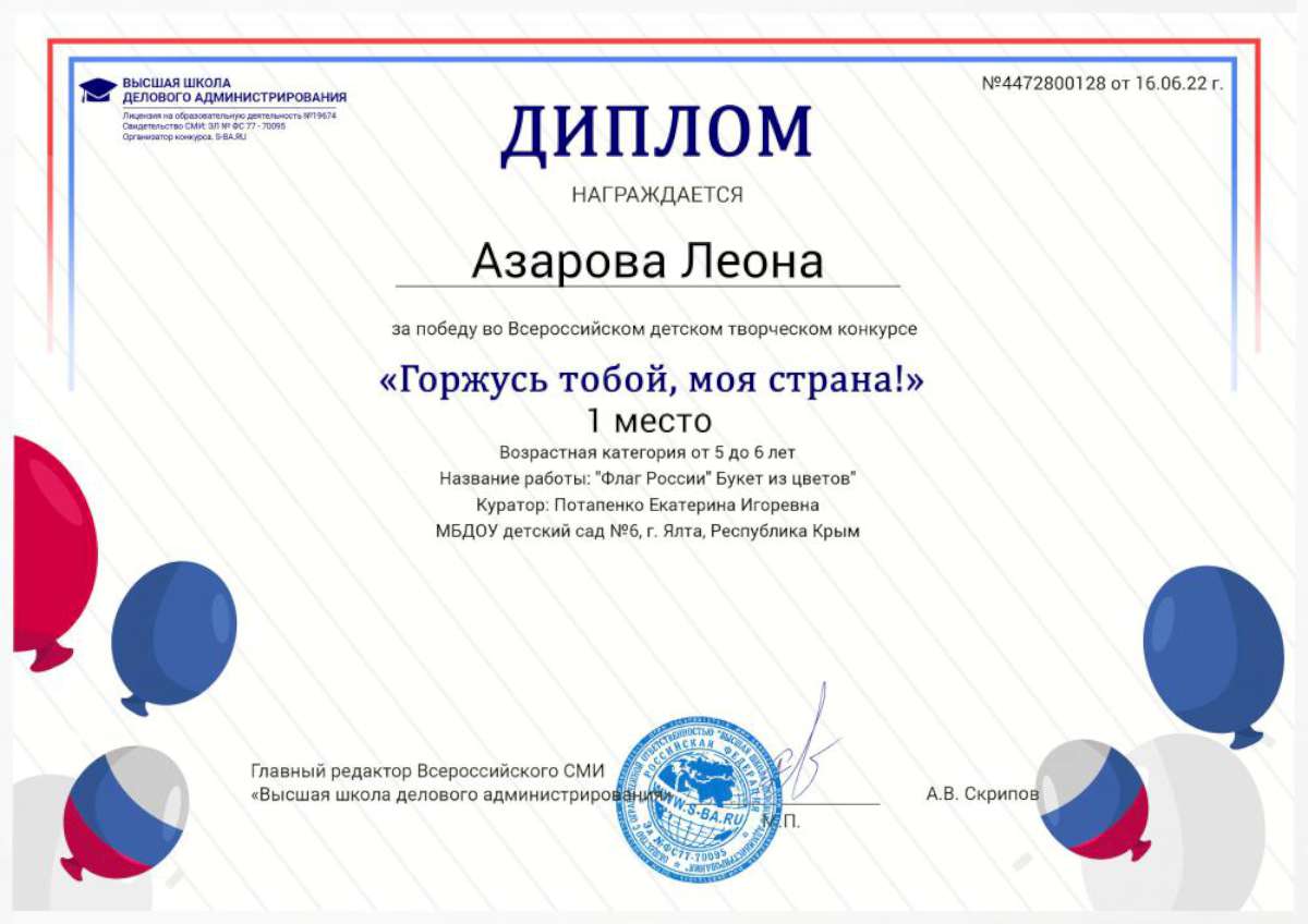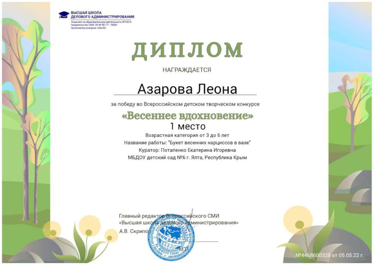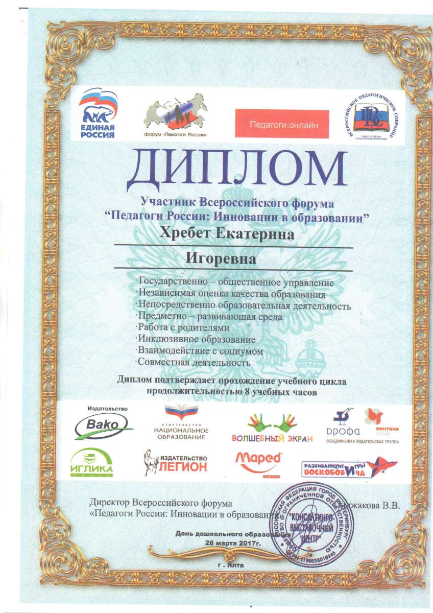 - Федеральное государственное автономное образовательное учреждение высшего образования «Крымский федеральный университет имени В.И. Вернадского» г. Симферополь (Диплом бакалавра №450115-118 30.06.2015г.) Специальность: «Дошкольное образование»