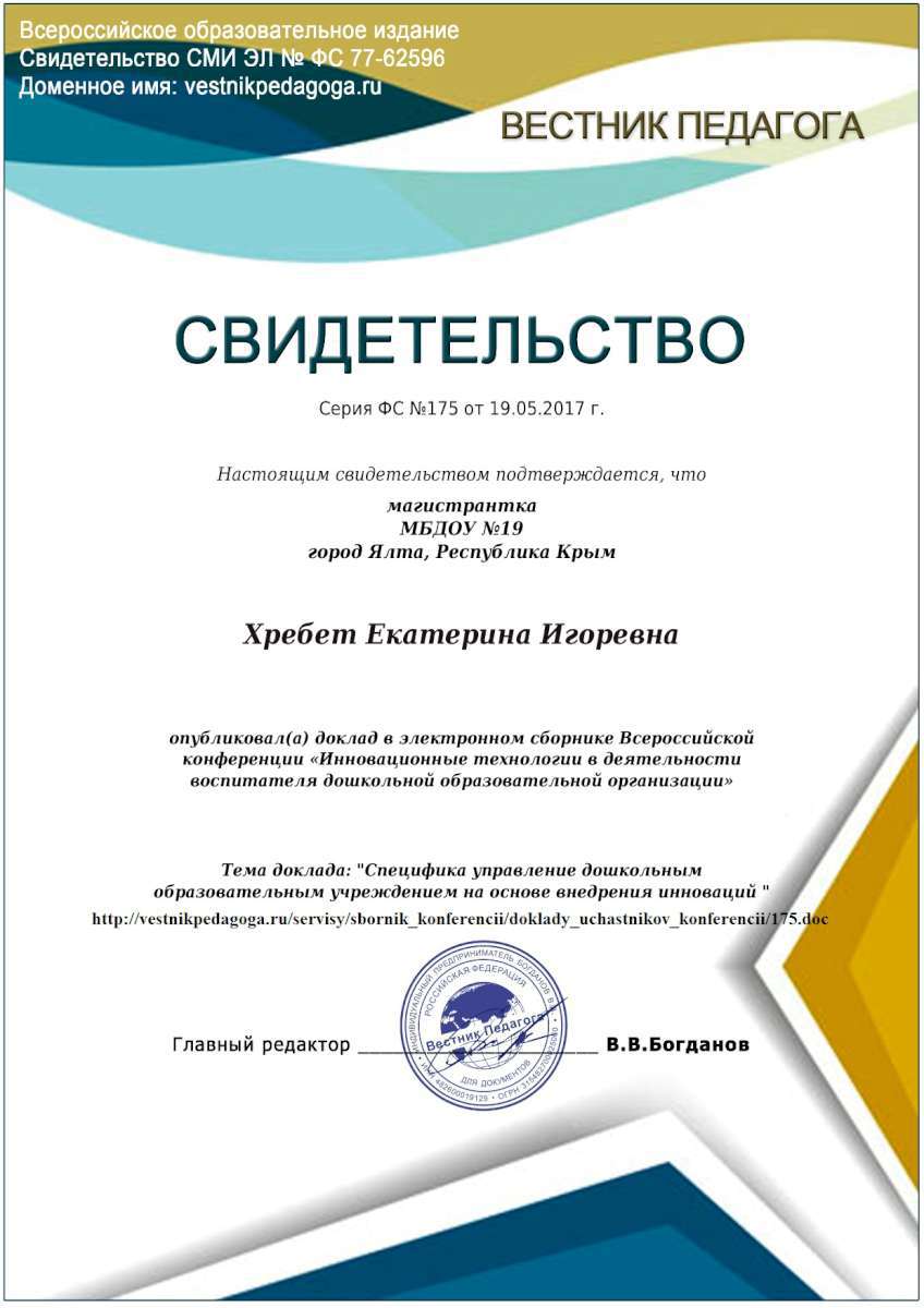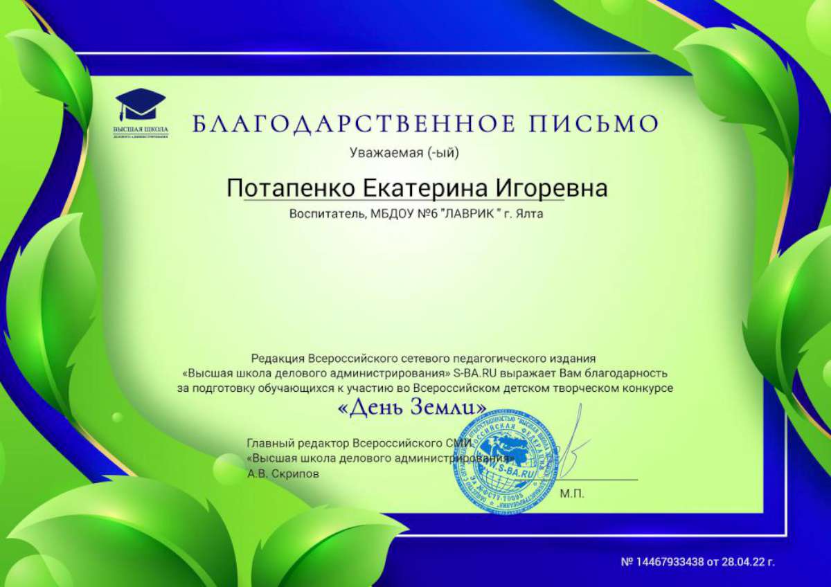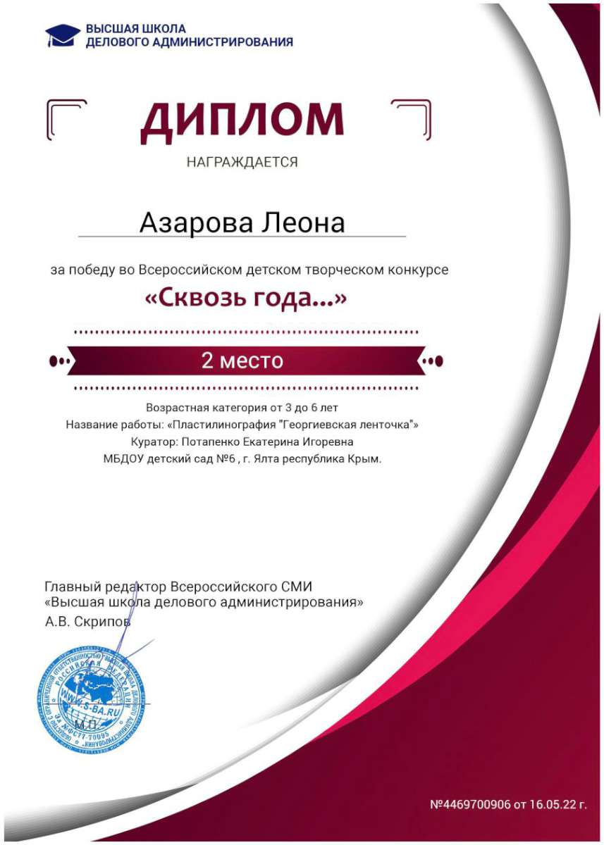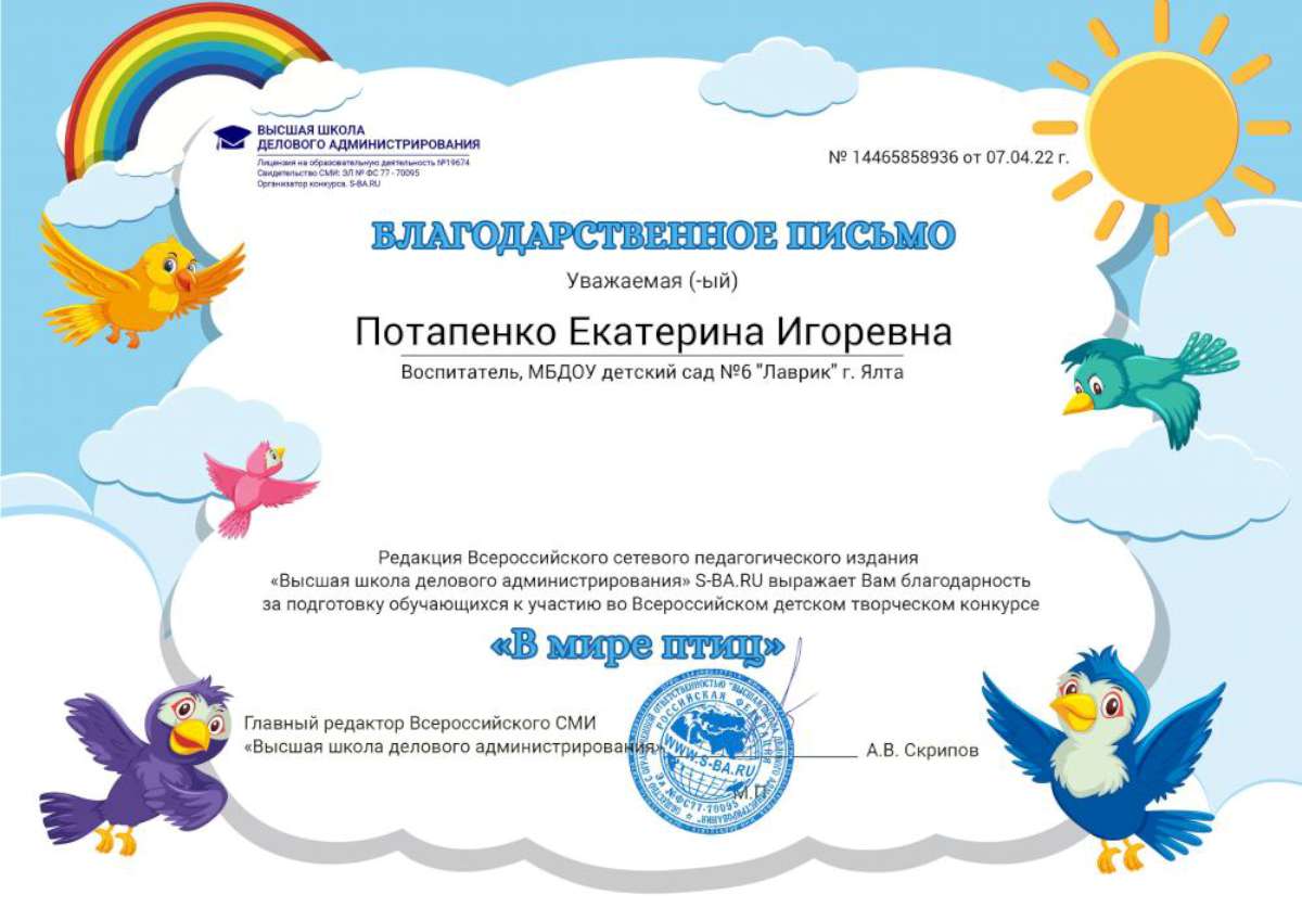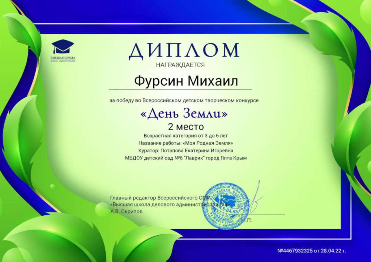 - Федеральное государственное автономное образовательное учреждение высшего образования «Крымский федеральный университет имени В.И. Вернадского» г. Симферополь (Диплом бакалавра №450115-118 30.06.2015г.) Специальность: «Дошкольное образование»