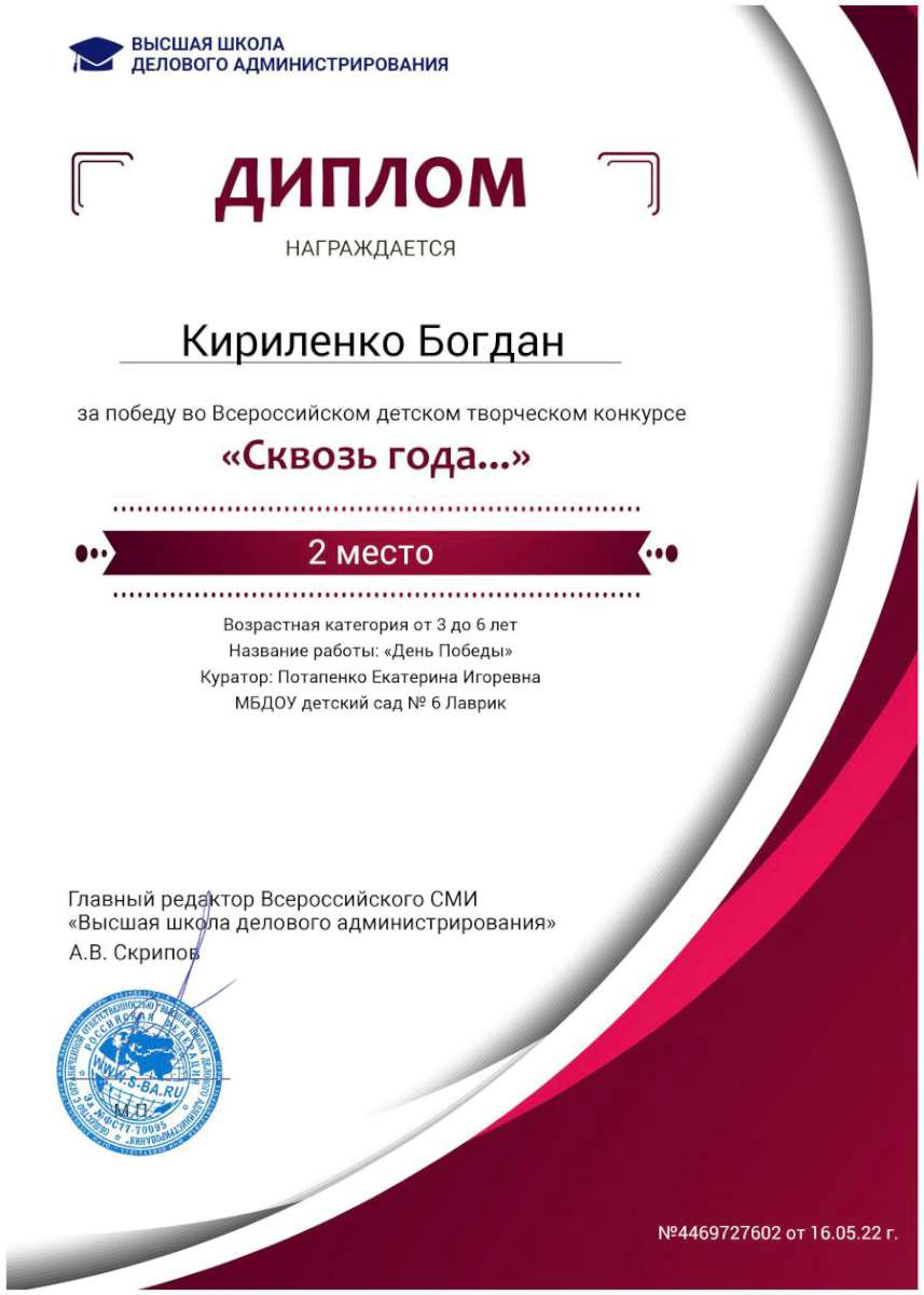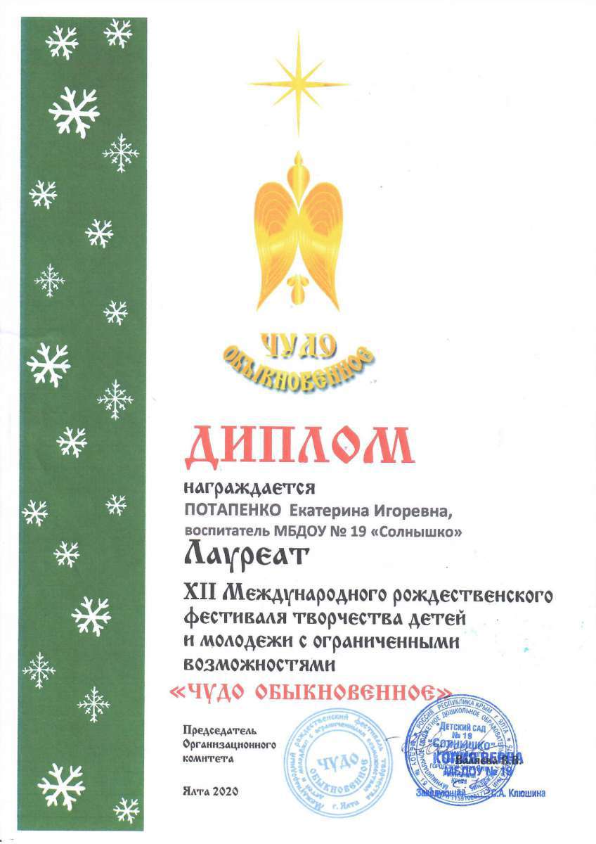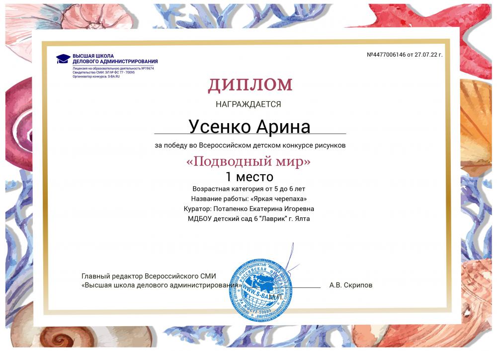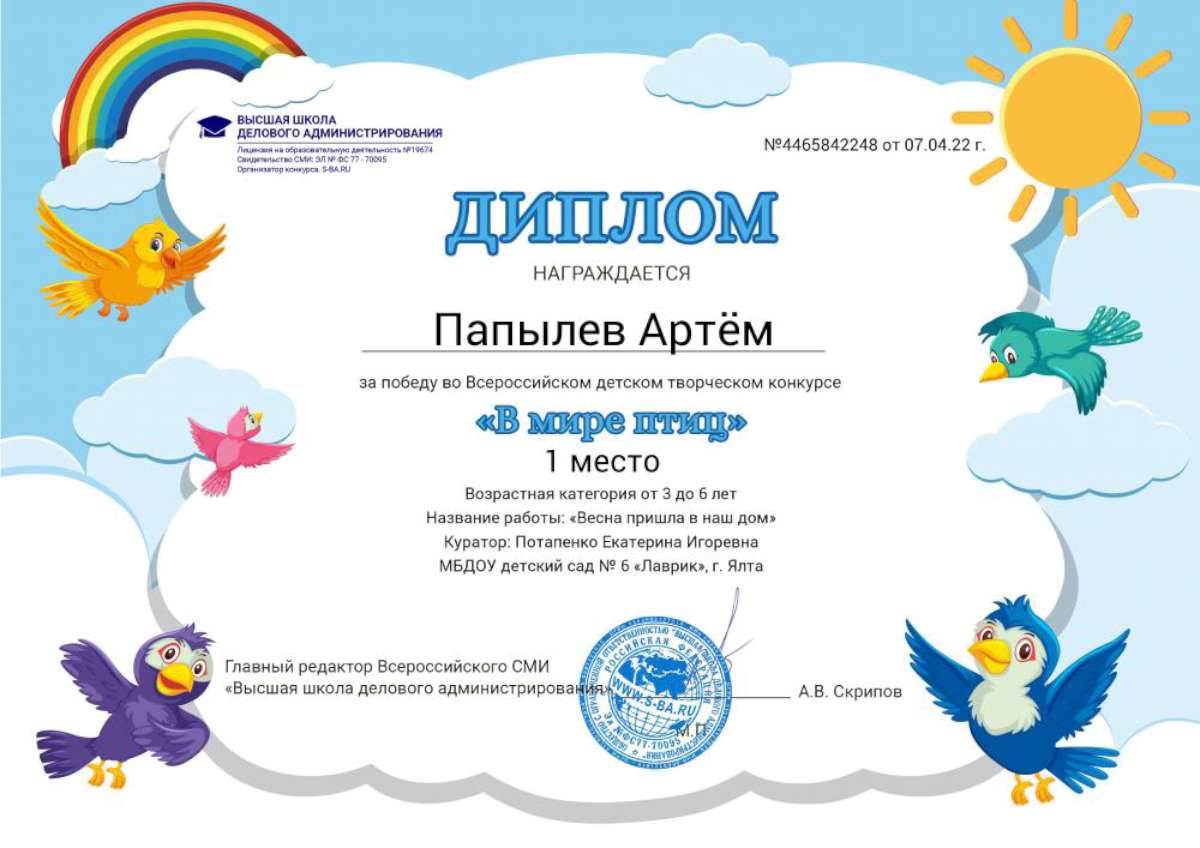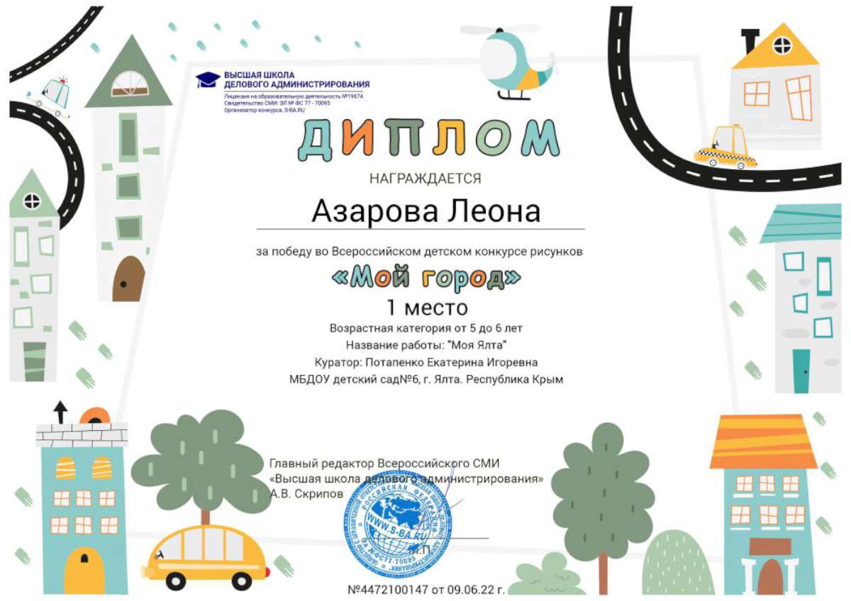 - Федеральное государственное автономное образовательное учреждение высшего образования «Крымский федеральный университет имени В.И. Вернадского» г. Симферополь (Диплом бакалавра №450115-118 30.06.2015г.) Специальность: «Дошкольное образование»