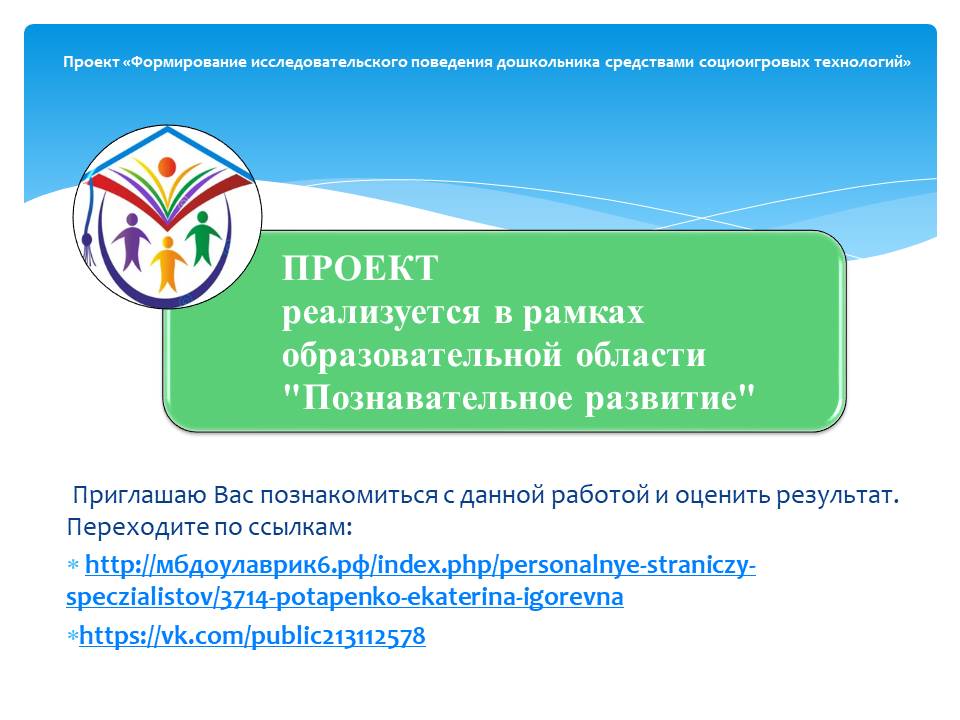 Я рада представить вашему вниманию проект: Формирование исследовательского поведения дошкольника средствами социоигровых технологий