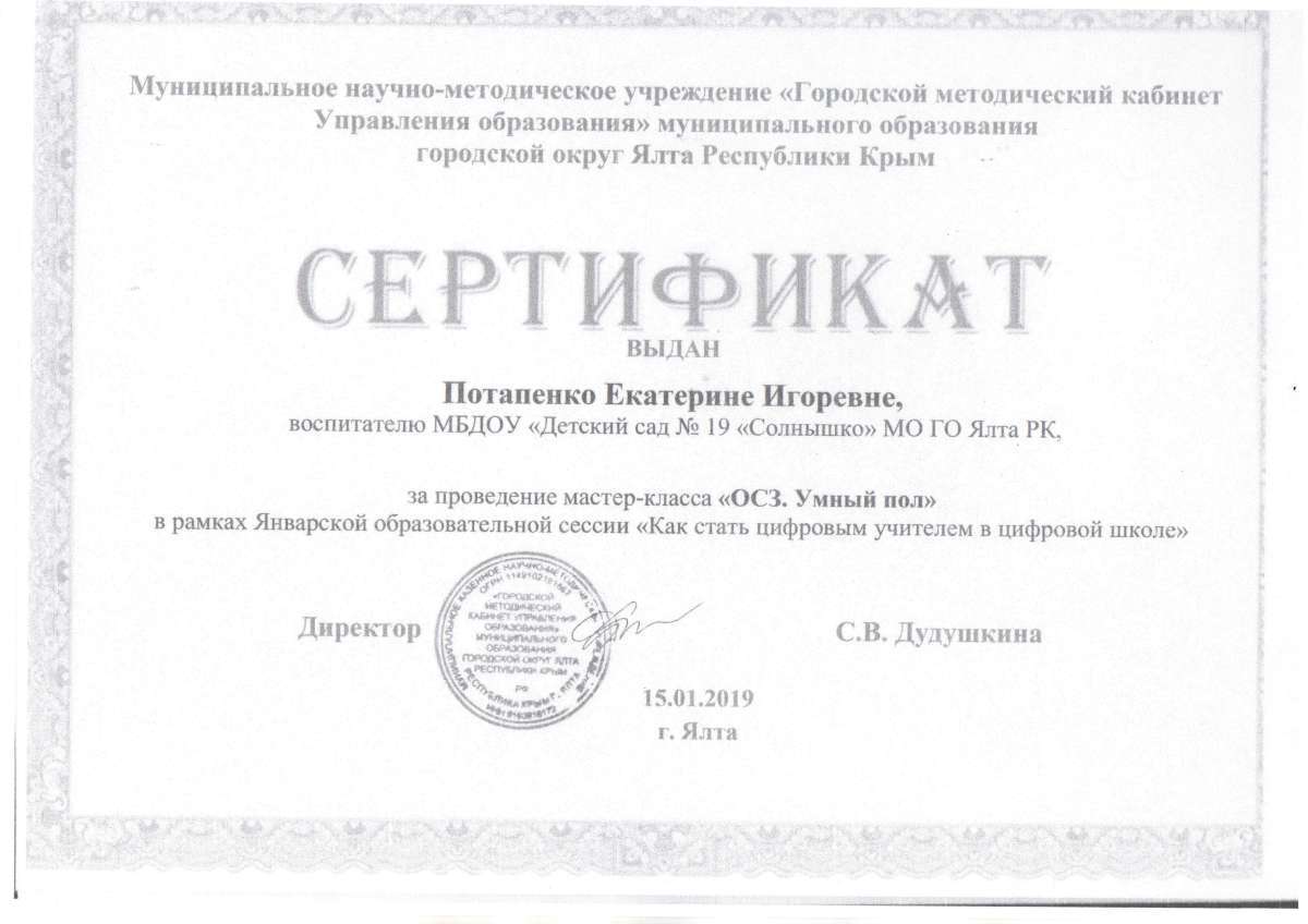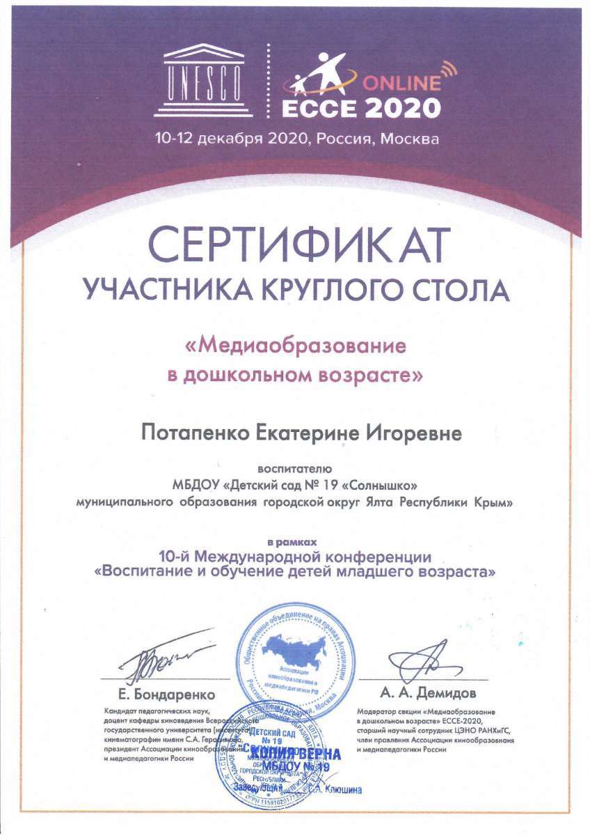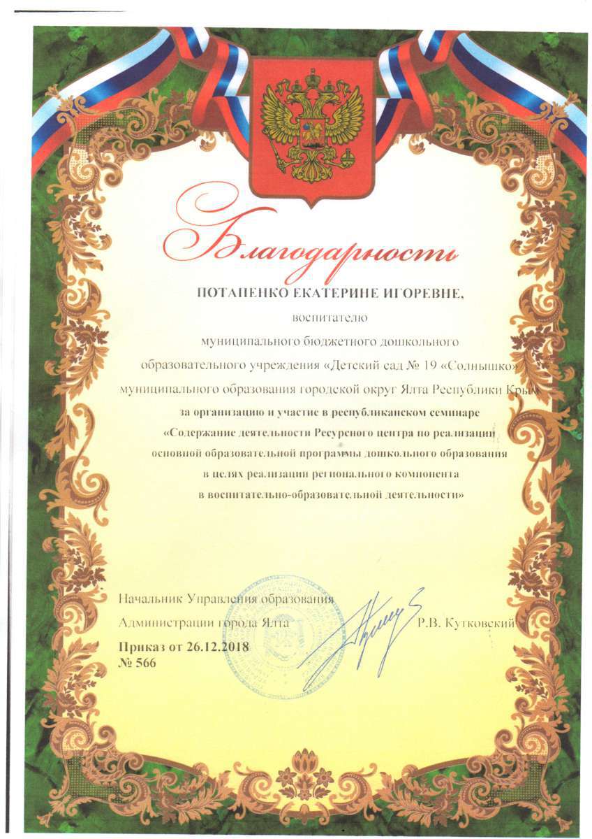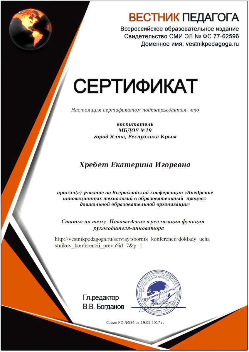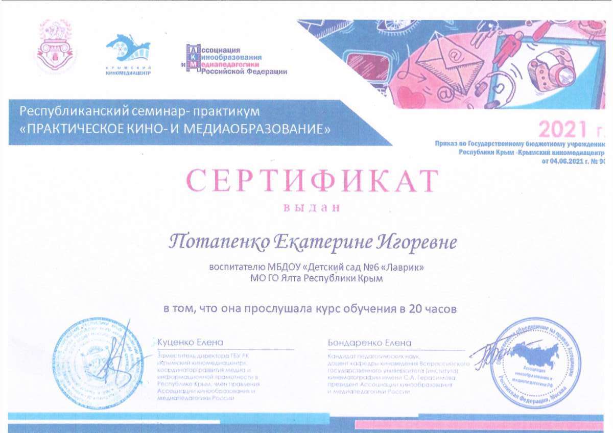 - Государственное бюджетное образовательное учреждение дополнительного профессионального образования Республики Крым «Крымский республиканский институт постдипломного педагогического образования» по программе: «Воспитательно-образовательная деятельность в дошкольной образовательной организации в условиях реализации регионального компонента в соответствии с требованиями ФГОС ДО» с 21.05.2018 г. по 04.06.2018г. (Удостоверение № РК 0000024048 (72ч)