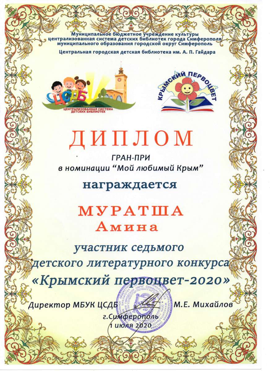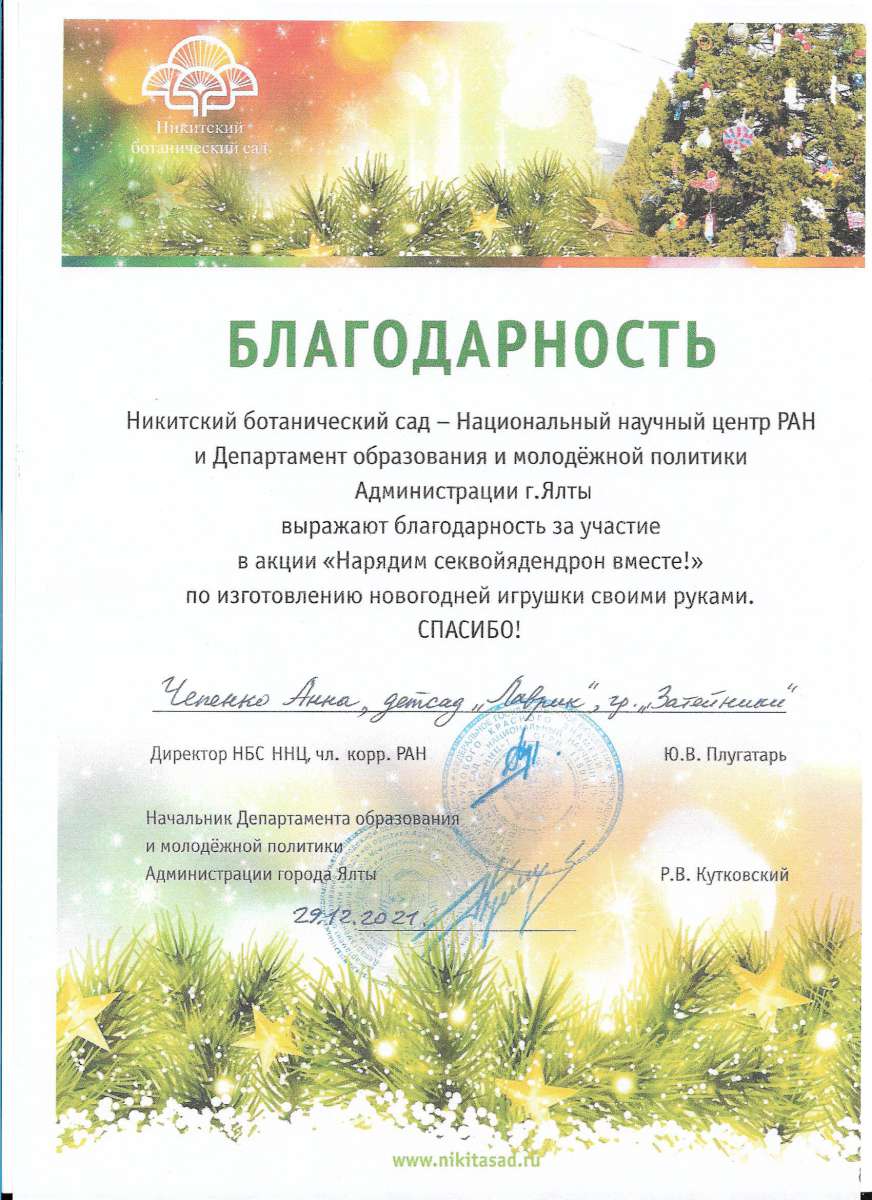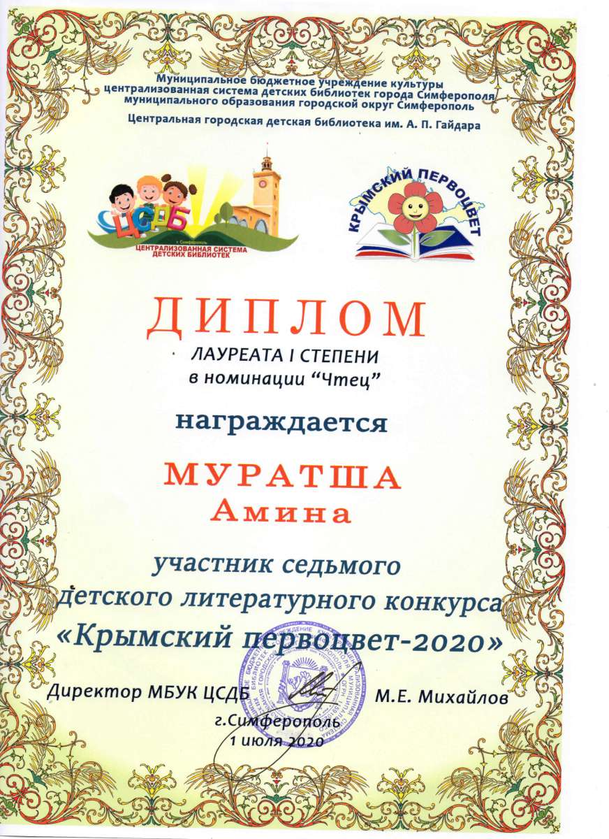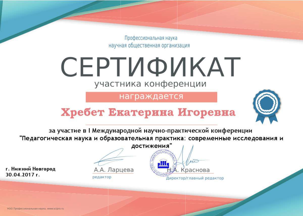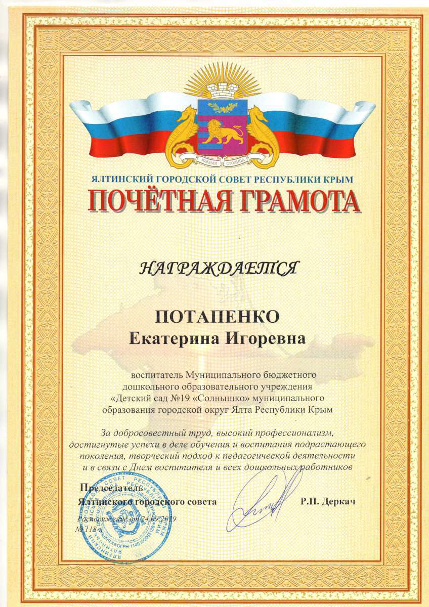 - Государственное бюджетное образовательное учреждение дополнительного профессионального образования Республики Крым «Крымский республиканский институт постдипломного педагогического образования» по программе: «Воспитательно-образовательная деятельность в дошкольной образовательной организации в условиях реализации регионального компонента в соответствии с требованиями ФГОС ДО» с 21.05.2018 г. по 04.06.2018г. (Удостоверение № РК 0000024048 (72ч)