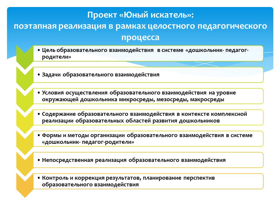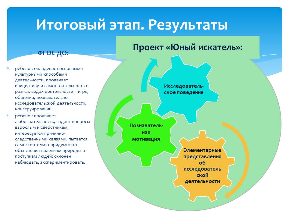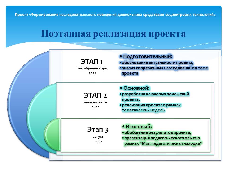 Проект «Юный искатель» в рамках основного этапа научной темы «Формирование исследовательского поведения дошкольника средствами социоигровых технологий» реализовывался поэтапно в рамках целостного педагогического процесса в период март-июль 2022 года.