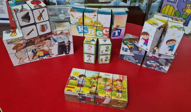 Головоломку я решила сделать, взяв за основу 8 одинаковых кубиков (4х4х4 см), На одном кубике 6 граней, на каждой из которых располагается своя индивидуальная картинка. Детали куба трансформируются, раскладываются, что позволяет использовать данное пособие в соответствии с определенной темой, занятием, игрой или упражнениям, я придала ему образовательный характер и внесла его в свою образовательную практику.