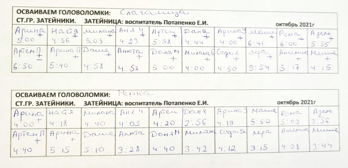 По результатам таблицы видно какое время понадобилось детям для решения головоломки. Знаки + и – свидетельствуют об интересе ребенка к процессу. В процессе работы будем наблюдать динамику (как будет меняться время для решения заданий).
