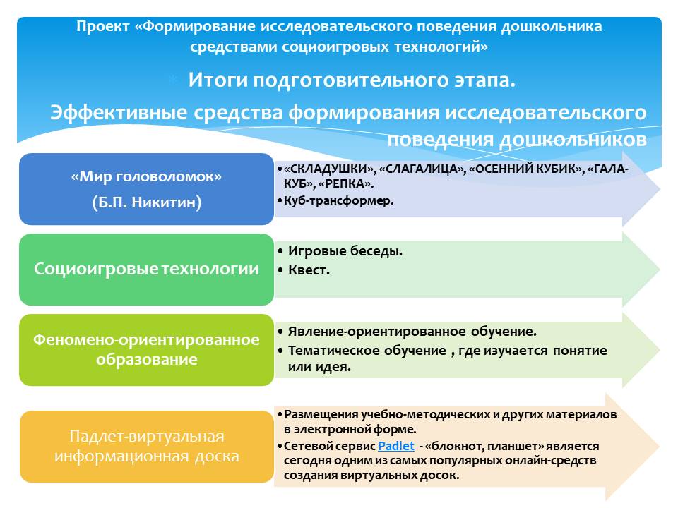 Подводя итоги реализация темы «Формирование исследовательского поведения дошкольника средствами социоигровых технологий» необходимо отметить, что результаты работы обобщены и представлены тетрадями с печатной основой, для дошкольников и их родителей, а также методическими рекомендациями для педагогов.